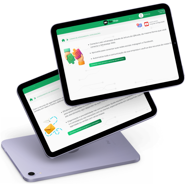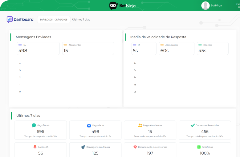 O BotNinja é seu atendente virtual incansável: responde clientes, agenda compromissos, dispara campanhas e até recupera contatos inativos – tudo sozinho, 24 horas por dia.
